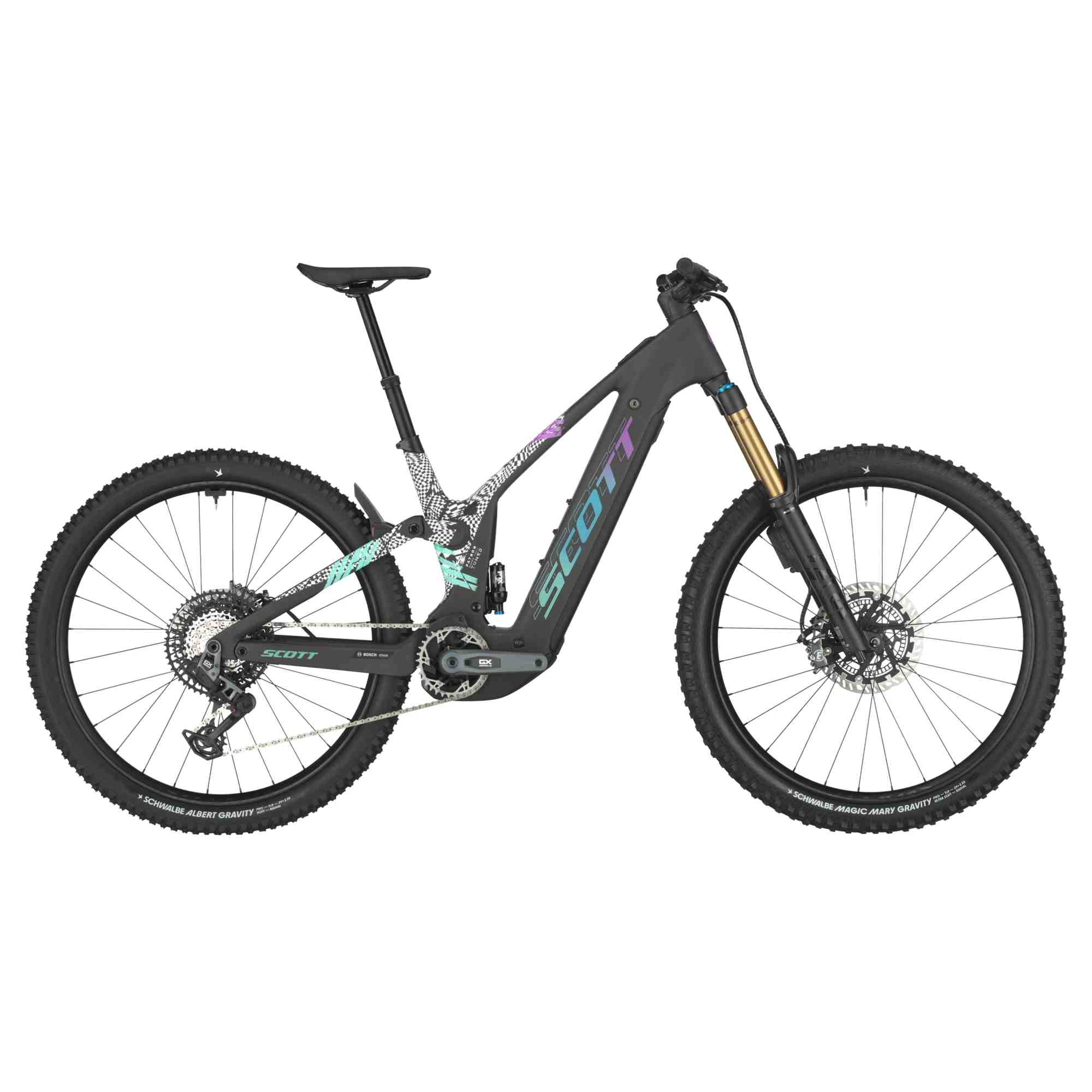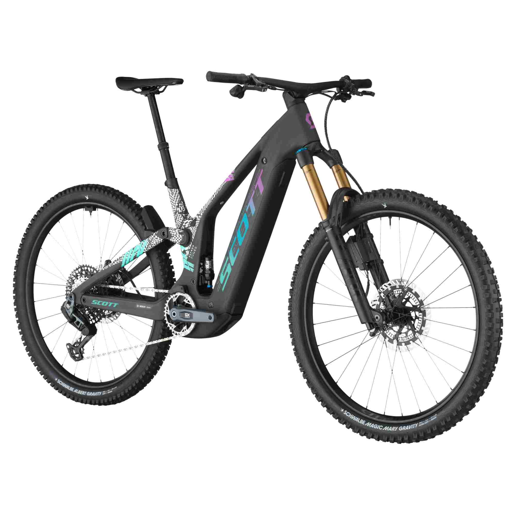 - RAHMEN: Carbon Frame Integrated Suspension Technology Virtual 4 Link kinematic / Adjustable head angle Syncros Cable Integration System Bosch Smart System / UDH Interface / 12x148mm with 55mm Chainline Bosch PowerMore Ready FEDERWEG: Front: 170mm / Rear: 150mm GABEL: FOX 38 Factory Grip X2 Air / Kashima HSC - LSC - HSR- LSR adjustable / QR Axle 15x110mm 44mm offset / tapered steerer 170mm travel DÄMPFER: FOX FLOAT X NUDE Factory EVOL Piggy Back Trunnion Kashima / SCOTT custom w. travel / geo adj. 3 modes: Climb-Ramp Control-Descend Custom large Air volume / Comp & Reb. Adj. Travel 150-100-Climb / T185X55mm LENKER-FERNBEDIENUNG: TracLoc Technology Rear Suspension & Dropper Remote 3 Rear Suspension modes ANTRIEBSEINHEIT: Bosch Performance CX EU: 25kmh / INT: 20mph AKKU:: PowerTube 800Wh DISPLAY: Bosch System Controller Mini Remote LADEGERÄT: 4A Charger SCHALTWERK: SRAM GX Eagle AXS Transmission 12 Speed Wireless Electronic Shift System SCHALTHEBEL: SRAM AXS Rocker Pod Controller KURBELSATZ: SRAM GX Eagle / Alloy KETTENFÜHRUNG: e*thirteen / e*spec Slider KETTENBLATT: SRAM Eagle Transmission 34T chainring KETTE: SRAM CN GX Eagle Transmission KASSETTE: SRAM GX Eagle XS 1275 Transmission 10-52 BREMSEN: Magura MT7 4 Piston / Bosch ABS Pro BREMSSCHEIBE: Front: MDR-P 220mm / Rear: MDR-P 203mm LENKER: Syncros Hixon iC Carbon Size S & M 15mm rise / Size L & XL 25mm rise back sweep 8° / 780mm Syncros Endurance lock-on grips SATTELSTÜTZE: Syncros Duncan Dropper Post 1.5S / Travel Adjust / 31.6mm S size 140mm / M size 180mm / L size 180mm / XL size 210mm SATTEL: Syncros Tofino-E 1.5 Regular Titanium rails STEUERSATZ: Syncros - Acros Angle adjust & Cable Routing HS System Stainless / +-0.6° head angle adjustment ZS56/28.6 ZS56/40 MTB LAUFRADSATZ: Syncros Revelstoke-E 1.5 IS F: 15x110mm R: 12x148mm Boost 30mm Tubeless ready rim 28H Syncros Axle w/Removable Lever with Tool VORDERREIFEN: Schwalbe Magic Mary 29x2.5" SuperGravity / PSF / Ultra Soft Tubeless ready 120TPI Foldable Bead HINTERREIFEN: Schwalbe Explore 29x2.5" SuperGravity / PSF / Soft Tubeless ready 120TPI Foldable Bead BELEUCHTUNG: Syncros integrated rear fender light Front Light Cable pre-installed EXTRAS: Syncros Fork Fender SRAM AXS Extension Cord GEWICHT IN KG (CA.): 24.3MAX. SYSTEMGEWICHT: 128kg Das Gesamtgewicht umfasst das Bike, den Fahrer, die Ausrüstung und eventuelles weiteres Gepäck