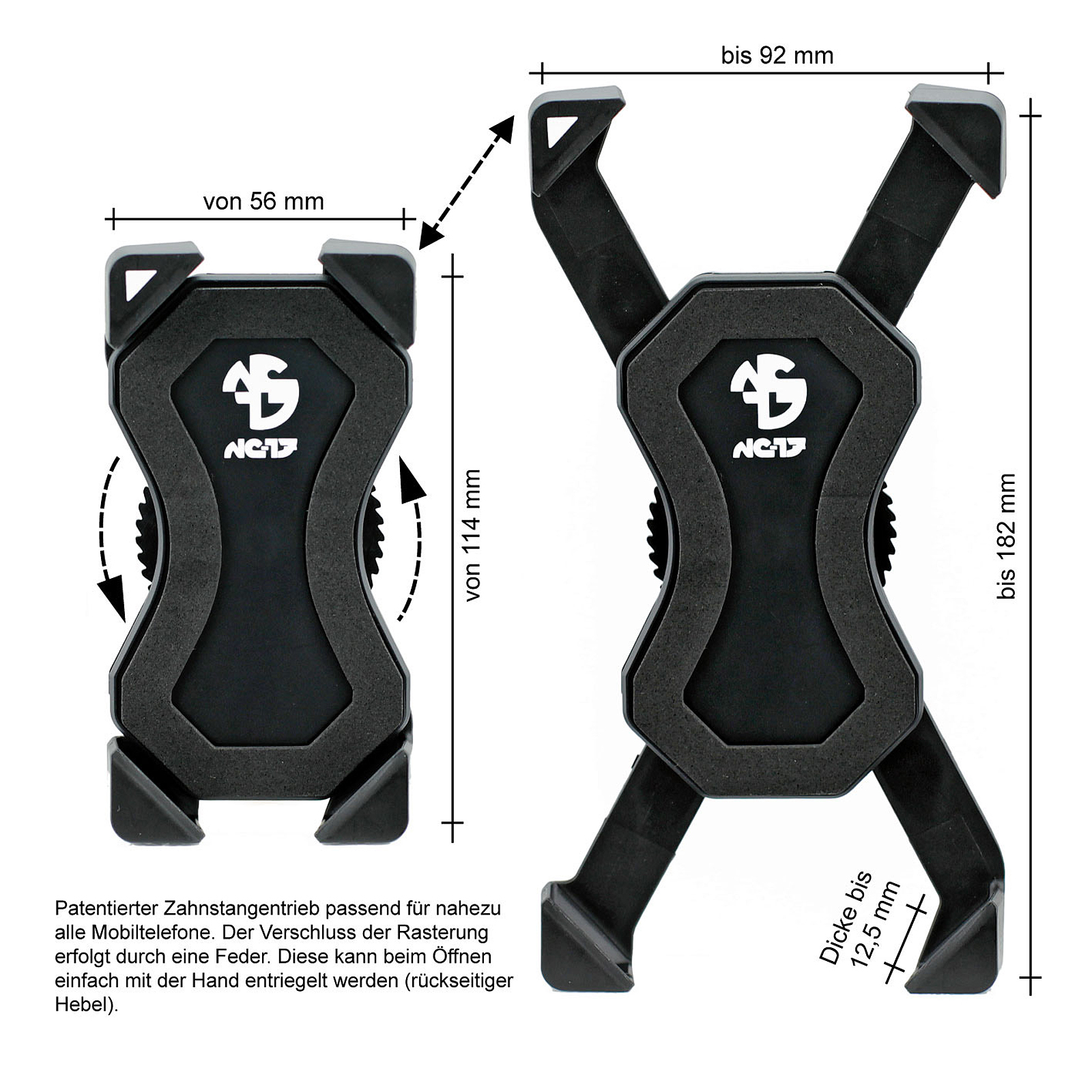 - Lieferumfang: NC-17 Universal Halter, Option: 3D Klemmhalter Lenker, 3 x Softpads Anpassung Telefon, 3 x Gummipads Anpassung Lenker